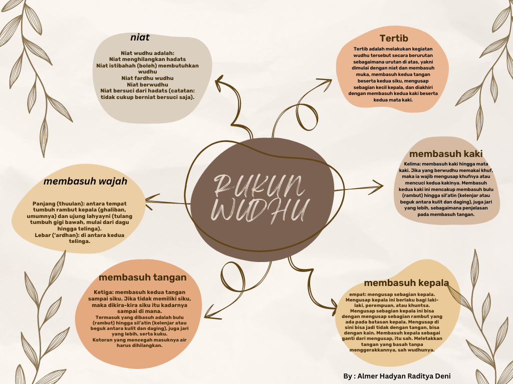Rukun Wudhu so i make mindmaping of Rukun wudhu with canva there are 5 rukun first is "Niat" and then "membasuh wajah" third is "membasuh tangan" fourt "membasuh muka fifth "membasuh kaki" there is 5 rukun wudhu. this is my fikih project about rukun wudhu. yes, if we don't carry out one of the pillars of ablution then our ablution is invalid and our prayer is also incomplete, maybe that's all from me, thank you