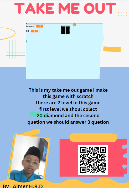 okay this is my game , the name of the game is take me out, like before, i make this game with scartch, i will tell what in this game, there are 2 level, level 1 and level 2, there are cat who want to go out from the room, in level 1 we must colect 20 diamond if we want to go out from room 1, in level 2 there are 3 box and per box there are 1 quetion and we must ansvwer the quetion, if we ready to answer 3 quetion we can go out.